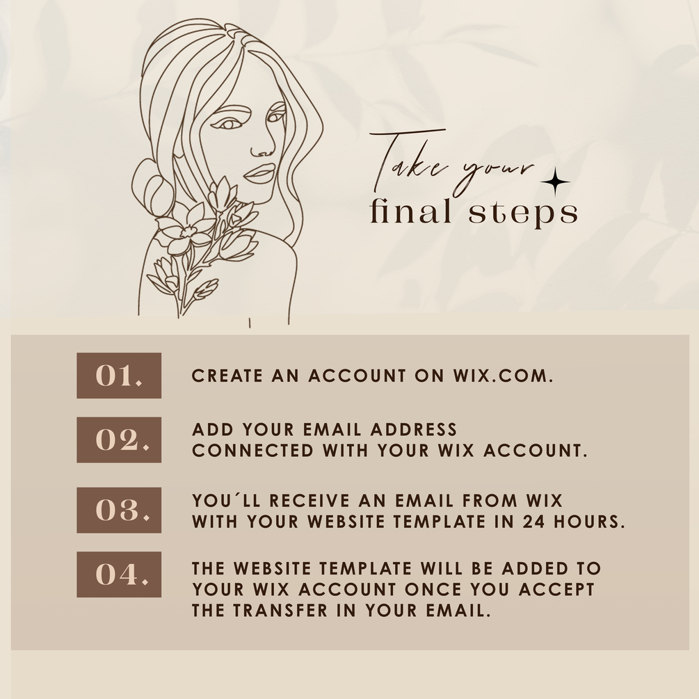 - After purchasing my product, please write your email address connected with the Wix account. You will receive a transfer link from Wix. Please allow up to 24 hours after purchase. If you don’t open the email from WIX and accept the transfer within 3 days, the transfer will expire.